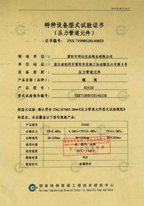 蝶阀调节阀型式试验证书