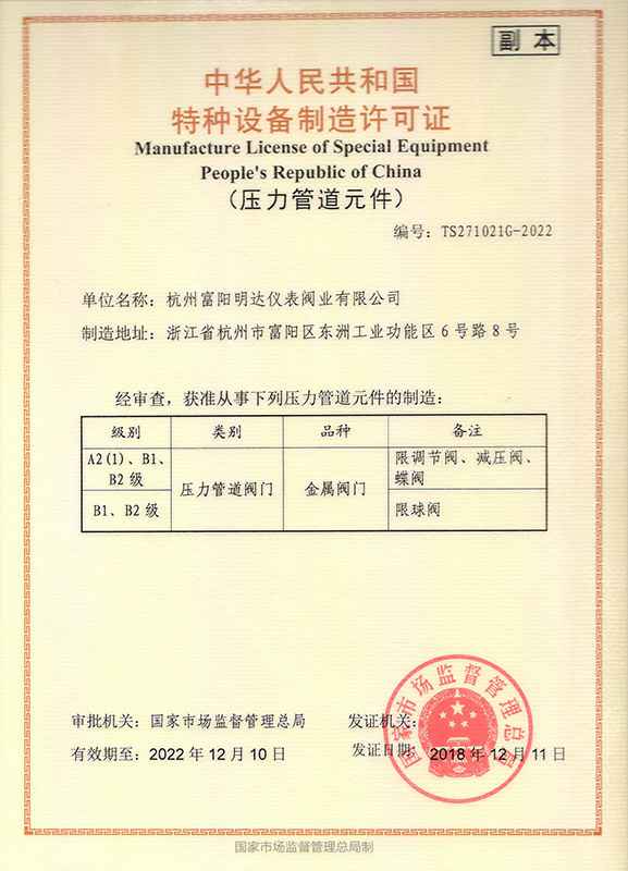 自力式调节阀型式试验证书